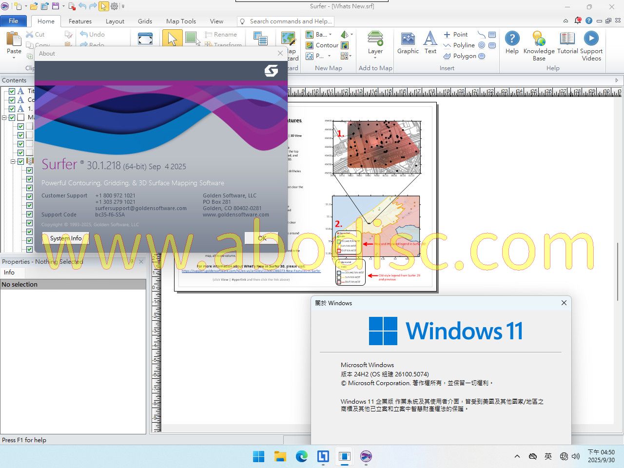 -=-=-=-=-=-=-=-=-=-=-=-=-=-=-=-=-=-=-=-=-=-=-=-=-=-=-=-=-=-=-=-=-=-=-=-= HoneRiSO Rip -=-=-=-=-=-=-=-=-=-=-=-=-=-=-=-=-=-=-=-=-=-=-=-=-=-=-=-=-=-=-=-=-=-=-=-= 軟體名稱: Surfer 30.1.218 語系版本: 英文版 光碟片數: 單片裝 保護種類: 破解檔 破解說明: 見最底下 系統支援: 適用 64 位元版的 Windows 10/11 硬體需求: PC 軟體類型: 空間科學繪圖 更新日期: 2025.09.24 軟體發行: Golden Software(O.D) 官方網站: https://www.goldensoftware.com/products/surfer 中文網站: https://surfer.softhome.com.tw/?page_id=311 軟體簡介: (以官方網站為準) -=-=-=-=-=-=-=-=-=-=-=-=-=-=-=-=-=-=-=-=-=-=-=-=-=-=-=-=-=-=-=-=-=-=-=-= Golden Software Surfer 是一套功能強大的資料視覺化軟體,適用於各種專業領 域,如地球科學、環境科學、工程學、地理資訊學等。它提供了豐富的繪圖和分析 工具,讓使用者能夠更有效地探索和呈現不同類型的資料。 首先,Surfer 有一個簡單易用的使用者界面,使得使用者無需太多的學習就能快 速上手。使用者可以透過拖放方式將資料檔案匯入 Surfer,也可以通過命令行或 腳本進行批次處理。 其次,Surfer 支援資料的插值、格點化和裁剪等功能,這些功能可以幫助使用者 產生高精度的 3D 模型和 2D 圖表。使用者可以根據自己的需求進行定制,並進行 各種操作,如旋轉、縮放、移動等等。 另外,Surfer 內建了豐富的繪圖範本和符號庫,使用者可以根據自己的需求選擇 不同的範本並加以修改,以產生符合自己要求的圖表。此外,使用者還可以對圖表 進行註解、增加標籤等操作,以便更好地理解資料。 還有,Surfer 還具有一系列分析工具,如等高線分析、坡度分析、峰值分析等等 。這些工具可以幫助使用者更好地瞭解資料,找出其中的規律和關聯性。同時還提 供了 3D 體積貼圖和動畫製作功能,使用者可以製作生動的資料展示效果。 最後,還支援多種輸出格式,如 PDF、JPG、PNG、GeoTIFF 等等。使用者可以將產 生的圖表和模型輸出到其他檔案中,以及與其他軟體進行整合使用。Scripter 和 Surfer Automation 兩個工具更是使得 Surfer 的操作更加高效。 總之,Golden Software Surfer 是一套應用廣泛、功能豐富、易於使用的資料視 覺化軟體,它能夠幫助不同領域的專業人士更好地處理和展示資料,並且具有高度 的可定制性和自動化功能。 介紹 -=-=-=-=-=-=-=-=-=-=-=-=-=-=-=-=-=-=-=-=-=-=-=-=-=-=-=-=-=-=-=-=-=-=-=-= 站長安裝測試環境與安裝說明: -=-=-=-=-=-=-=-=-=-=-=-=-=-=-=-=-=-=-=-=-=-=-=-=-=-=-=-=-=-=-=-=-=-=-=-= ‧測試環境 Windows 11.24H2 64位元繁體中文企業版、AMD CPU、4 GB 記憶體。 ‧見光碟 "安裝說明.txt" 中文說明-=-=-=-=-=-=-=-=-=-=-=-=-=-=-=-=-=-=-=-=-=-=-=-=-=-=-=-=-=-=-=-=-=-=-=-=