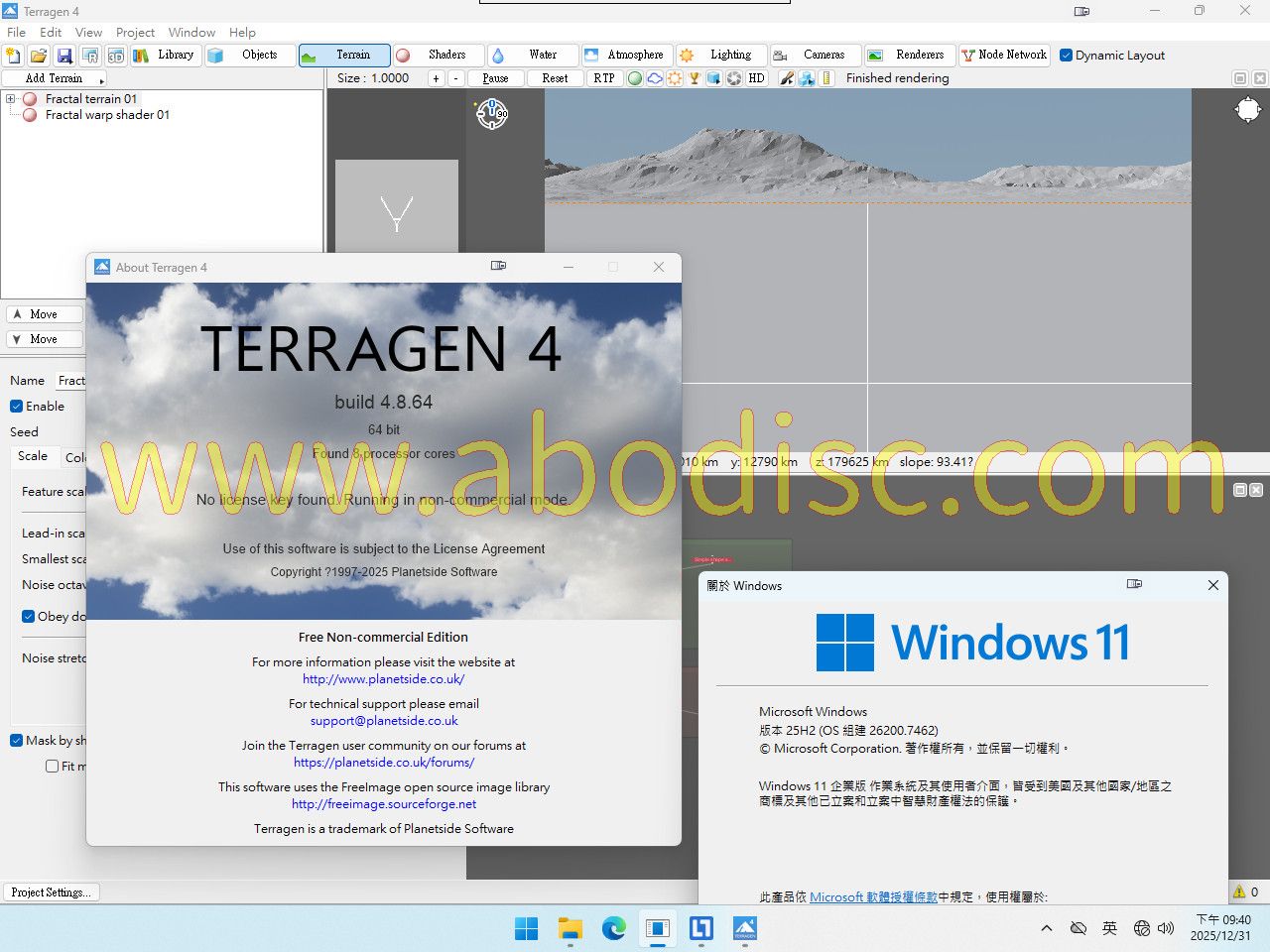 -=-=-=-=-=-=-=-=-=-=-=-=-=-=-=-=-=-=-=-=-=-=-=-=-=-=-=-=-=-=-=-=-=-=-=-= HoneRiSO Rip -=-=-=-=-=-=-=-=-=-=-=-=-=-=-=-=-=-=-=-=-=-=-=-=-=-=-=-=-=-=-=-=-=-=-=-= 軟體名稱: Terragen Pro 4.8.64 語系版本: 英文版 光碟片數: 單片裝 保護種類: 授權檔 破解說明: 見最底下 系統支援: 適用 64 位元版的 Windows 10/11 硬體需求: PC 軟體類型: 自然景觀製作 更新日期: 2025.12.21 軟體發行: Planetside Software(O.D) 官方網站: https://planetside.co.uk/buy-terragen/terragen-4-professional 中文網站: 無 軟體簡介: (以官方網站為準) -=-=-=-=-=-=-=-=-=-=-=-=-=-=-=-=-=-=-=-=-=-=-=-=-=-=-=-=-=-=-=-=-=-=-=-= Terragen 是一套專業的地形產生和貼圖軟體,廣泛應用於 3D視覺效果、動畫製作 和遊戲開發等領域。它由 Planetside Software 開發,旨在幫助藝術家和開發者 創造出逼真的自然景觀。 Terragen 的核心功能是產生高度真實的地形和自然環境。使用者可以通過多種工 具和參數設定,創造出山脈、湖泊、林地等多樣化的地貌。軟體內建的程式產生技 術,允許使用者調整地形的高度圖、紋理以及植被分佈,從而製作出獨特的自然場 景。 除了地形產生,Terragen 還提供強大的照明和氣候控制功能。使用者可以自由地 調整太陽的位置、雲層的厚度以及其他氣候參數,創造出各種不同的環境效果。不 論是陽光明媚的白天,還是煙霧繚繞的黃昏,Terragen 都能真實再現,提升作品 的視覺效果。 在貼圖方面,Terragen 支援高解析度的貼圖,並能產生靜態圖片或動畫。它的貼 圖引擎可以處理複雜的光照效果,例如全局光照和反射,這使得最終的作品呈現出 極高的品質。此外,軟體還支援多種檔案格式,方便使用者將成果輸出到其他應用 程式中進行後期處理。 Terragen 的靈活性和強大的功能,使它成為視覺藝術家和遊戲開發者的重要工具 。無論是在電影、電玩或是其他媒體上,Terragen 都能幫助使用者製作出引人入 勝的自然景觀,無論是細膩的風景還是壯觀的宏圖,讓觀眾感受到身臨其境的視覺 享受。 介紹 -=-=-=-=-=-=-=-=-=-=-=-=-=-=-=-=-=-=-=-=-=-=-=-=-=-=-=-=-=-=-=-=-=-=-=-= 站長安裝測試環境與安裝說明: -=-=-=-=-=-=-=-=-=-=-=-=-=-=-=-=-=-=-=-=-=-=-=-=-=-=-=-=-=-=-=-=-=-=-=-= ‧測試環境 Windows 11.25H2 64位元繁體中文企業版、AMD CPU、4 GB 記憶體。 ‧見光碟 "安裝說明.txt" 中文說明-=-=-=-=-=-=-=-=-=-=-=-=-=-=-=-=-=-=-=-=-=-=-=-=-=-=-=-=-=-=-=-=-=-=-=-=