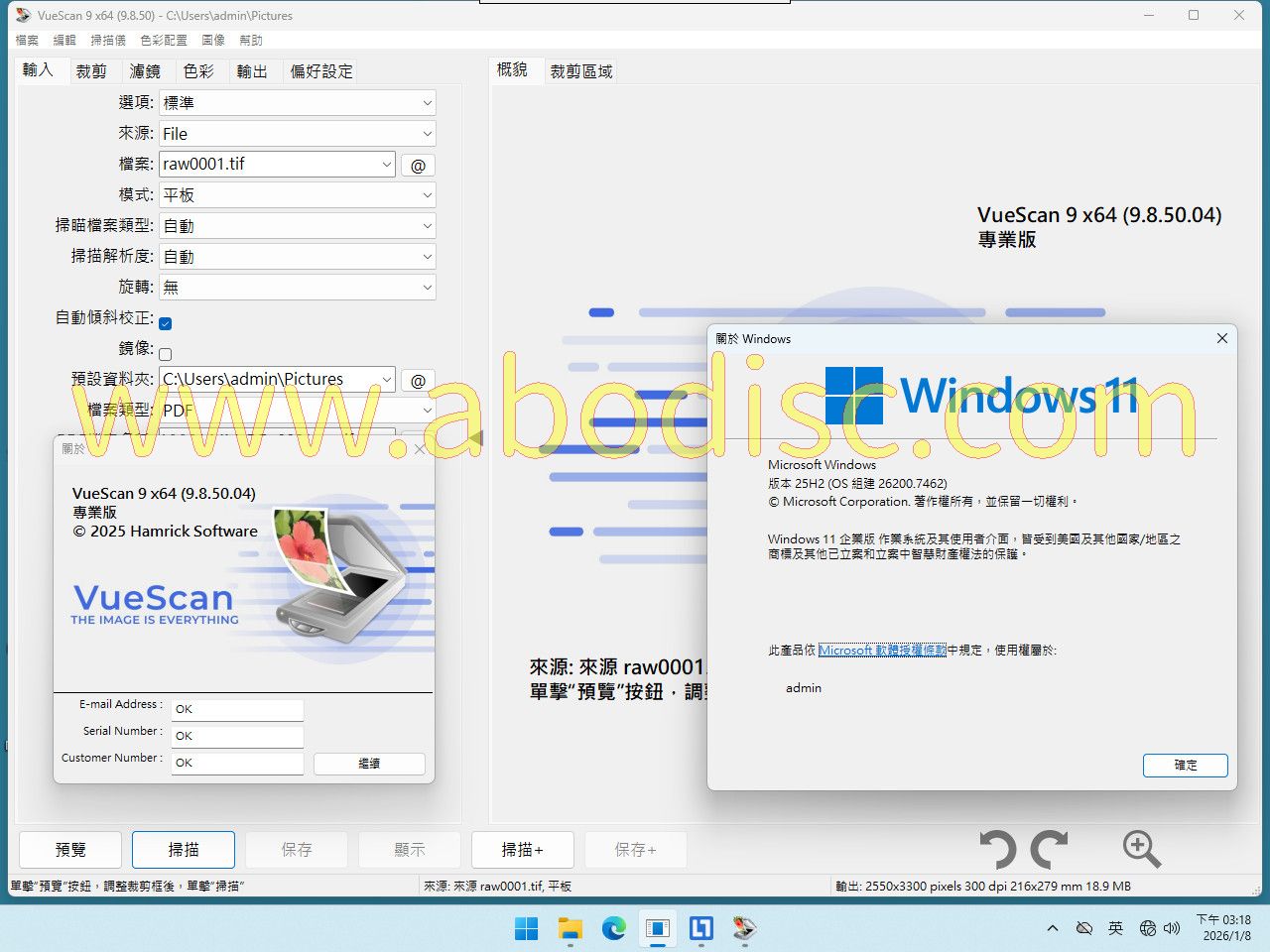 -=-=-=-=-=-=-=-=-=-=-=-=-=-=-=-=-=-=-=-=-=-=-=-=-=-=-=-=-=-=-=-=-=-=-=-= HoneRiSO Rip -=-=-=-=-=-=-=-=-=-=-=-=-=-=-=-=-=-=-=-=-=-=-=-=-=-=-=-=-=-=-=-=-=-=-=-= 軟體名稱: VueScan Pro 9.8.50 語系版本: 英文/繁體中文版 光碟片數: 單片裝 保護種類: 檔案破解 破解說明: 見最底下 系統支援: 適用 64 位元版的 Windows 7/8/8.1/10/11 硬體需求: PC 軟體類型: 底片掃瞄應用 更新日期: 2026.01.06 軟體發行: Hamrick Software(O.D) 官方網站: https://www.hamrick.com 中文網站: 無 軟體簡介: (以官方網站為準) -=-=-=-=-=-=-=-=-=-=-=-=-=-=-=-=-=-=-=-=-=-=-=-=-=-=-=-=-=-=-=-=-=-=-=-= VueScan 是一套功能強大的掃瞄軟體,它可以讓使用者輕鬆地掃瞄和處理各種類型 的檔案和圖片。無論是個人使用者還是專業使用者,VueScan 都提供了一個直覺式 且易於使用的界面,使使用者可以輕鬆地控制和管理他們的掃瞄設備。 VueScan 支援各種不同類型的掃瞄設備,包括平板式掃瞄器、照片掃瞄器和多功能 一體機。它與超過 6000 多種不同品牌和型號的掃瞄設備相容,這使得它成為一個 非常靈活和通用的掃瞄解決方案。 VueScan 提供了許多先進的掃瞄功能,例如自動裁剪、色彩校正、影像修復和多頁 掃瞄。這些功能使使用者能夠輕鬆地獲得高品質的掃瞄結果,並且可以根據他們的 需求進行進一步的後期處理。 除了基本的掃瞄功能外,VueScan 還提供了一些高級功能,例如批次掃瞄、OCR(光 學字符識別) 和多掃瞄輸出格式支援。這些功能使使用者能夠更有效地處理大量的 檔案和圖片,並且能夠將掃瞄結果轉換為可編輯的文字檔案或其他格式。 VueScan 還具有一個強大的使用者社區,使用者可以在這裡分享他們的經驗和技巧 ,並獲得來自其他使用者和開發人員的支援。這使得使用 VueScan 變得更加容易 和愉快,並且使用者可以從其他人的經驗中學習到更多有關掃瞄的知識和技巧。 總結來說,VueScan 是一個功能強大且易於使用的掃瞄軟體,它提供了許多先進的 掃瞄功能,並與各種不同品牌和型號的掃瞄設備相容。無論是個人使用者還是專業 使用者,VueScan 都是一個理想的掃瞄解決方案,可以幫助使用者輕鬆地處理和管 理他們的掃瞄任務。 介紹 -=-=-=-=-=-=-=-=-=-=-=-=-=-=-=-=-=-=-=-=-=-=-=-=-=-=-=-=-=-=-=-=-=-=-=-= 站長安裝測試環境與安裝說明: -=-=-=-=-=-=-=-=-=-=-=-=-=-=-=-=-=-=-=-=-=-=-=-=-=-=-=-=-=-=-=-=-=-=-=-= ‧測試環境 Windows 11.25H2 64位元繁體中文企業版、AMD CPU、4 GB 記憶體。 ‧見光碟 "安裝說明.txt" 中文說明-=-=-=-=-=-=-=-=-=-=-=-=-=-=-=-=-=-=-=-=-=-=-=-=-=-=-=-=-=-=-=-=-=-=-=-=